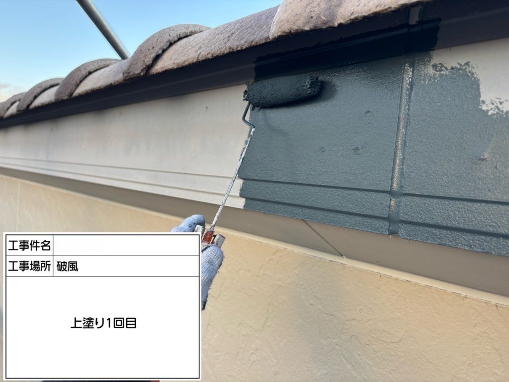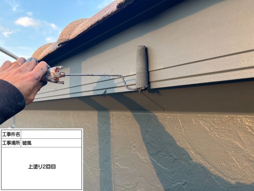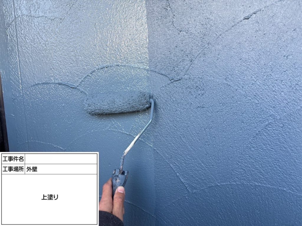 いよいよ仕上げの上塗りです!上塗りは、塗装工程の最終仕上げです!美観を整えるだけでなく、外壁を紫外線や雨風から長期間守るバリアのような役割をしています!