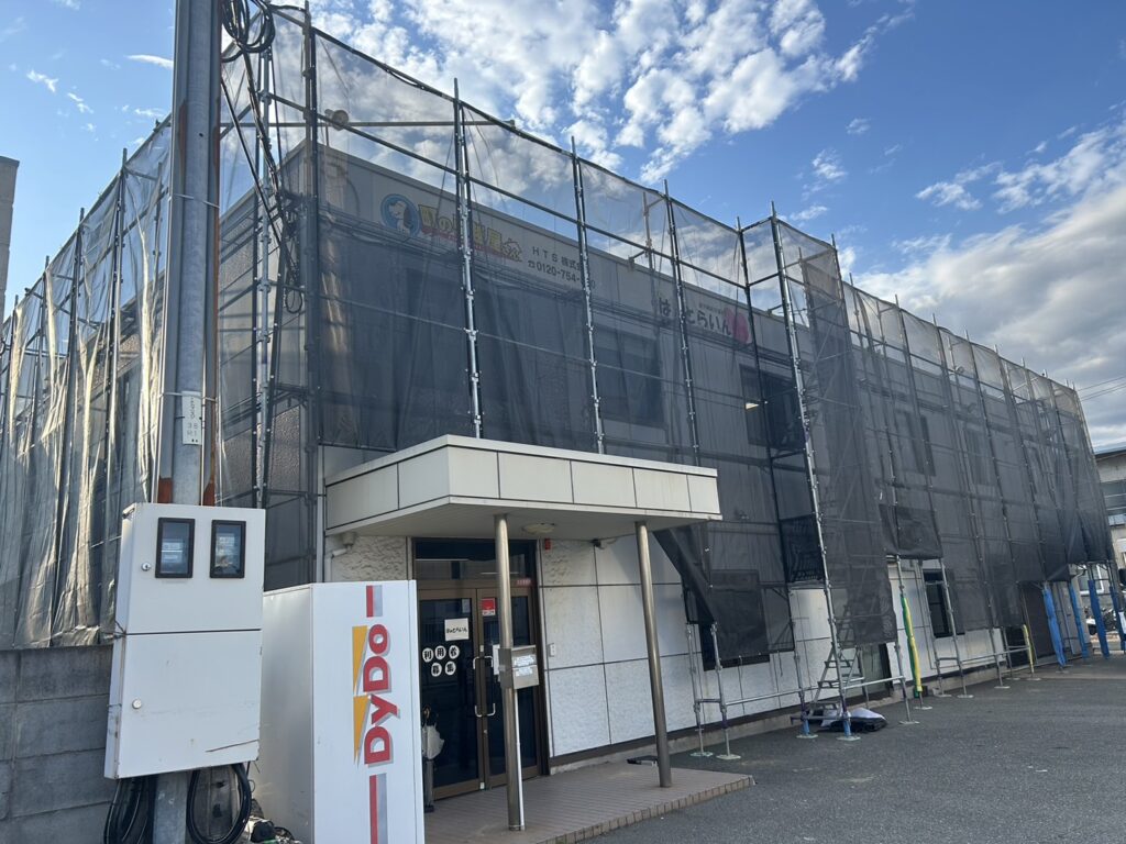 建物の正面側は敷地に余裕があり、足場の設置自体はしやすい環境でしたが、人の出入りが多い建物でした。