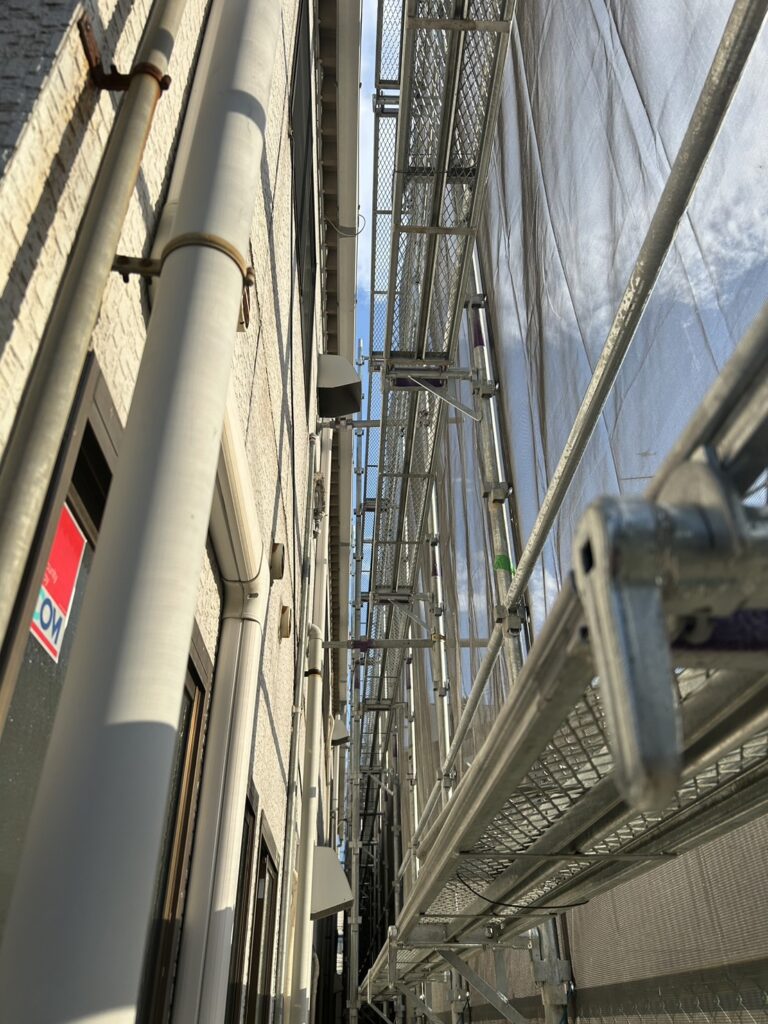 これから外壁メンテナンス工事が行われるため、その土台となる仮設足場の組み立て作業です。