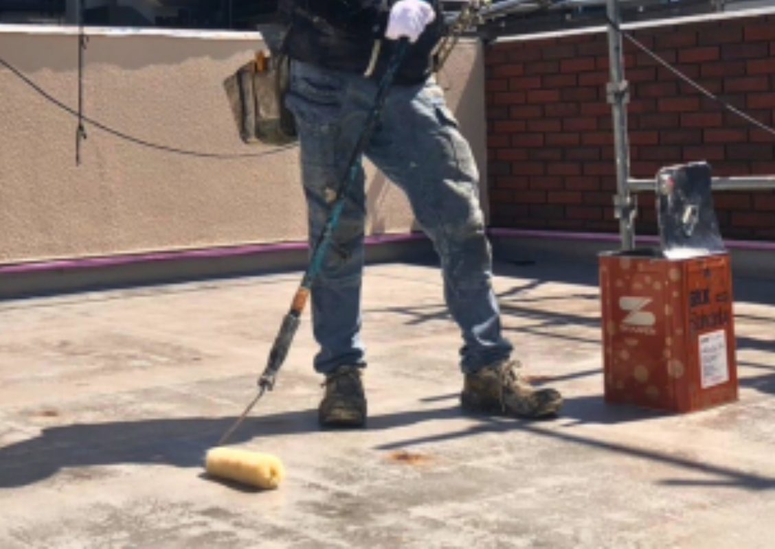 防水工事の下塗り材といのうは「ボンド」のような役割があります。つまり、中塗り材とくっつけて防水層を作るために大事な工程です。 塗り残しが無いように、隅々まで塗っていきます。
