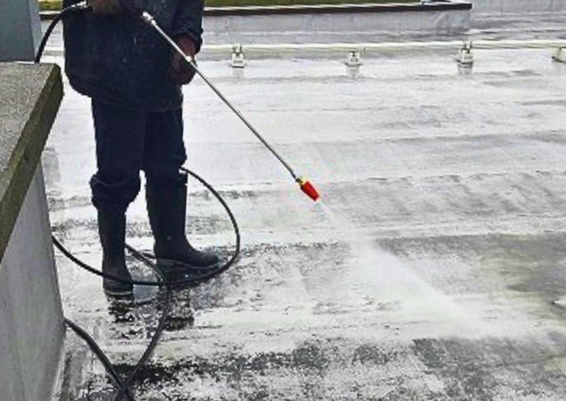 高圧洗浄は、床についているコケや粉じんなどをしっかり取り除き、長持ちするきれいな下地にすることが目的です。塗福の職人は高圧洗浄の際に、傷んでいる部分をしっかり確認し、施工の段取りも構想します。